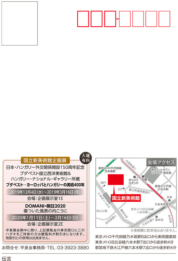 ☆2020年 平泉会選抜展 ご案内 手づくりこそ命を元気にし未来を築きます 【会期】2020年6月16日(火)〜21日(日) 入場無料 午前9時30分〜午後5時30分(入場〆切午後5時) 最終日午後1時30分閉会 (入場〆切午後1時) 【入場料】 無料 【会場】 東京都美術館 2階第4展示室 (東京都台東区上野公園) アクセス JR「上野駅」公園口より徒歩7分 京成電鉄「上野駅」より徒歩10分 東京メトロ銀座線・日比谷線「上野駅」7番出口より徒歩10分 主催:特定非営利活動法人平泉会 |