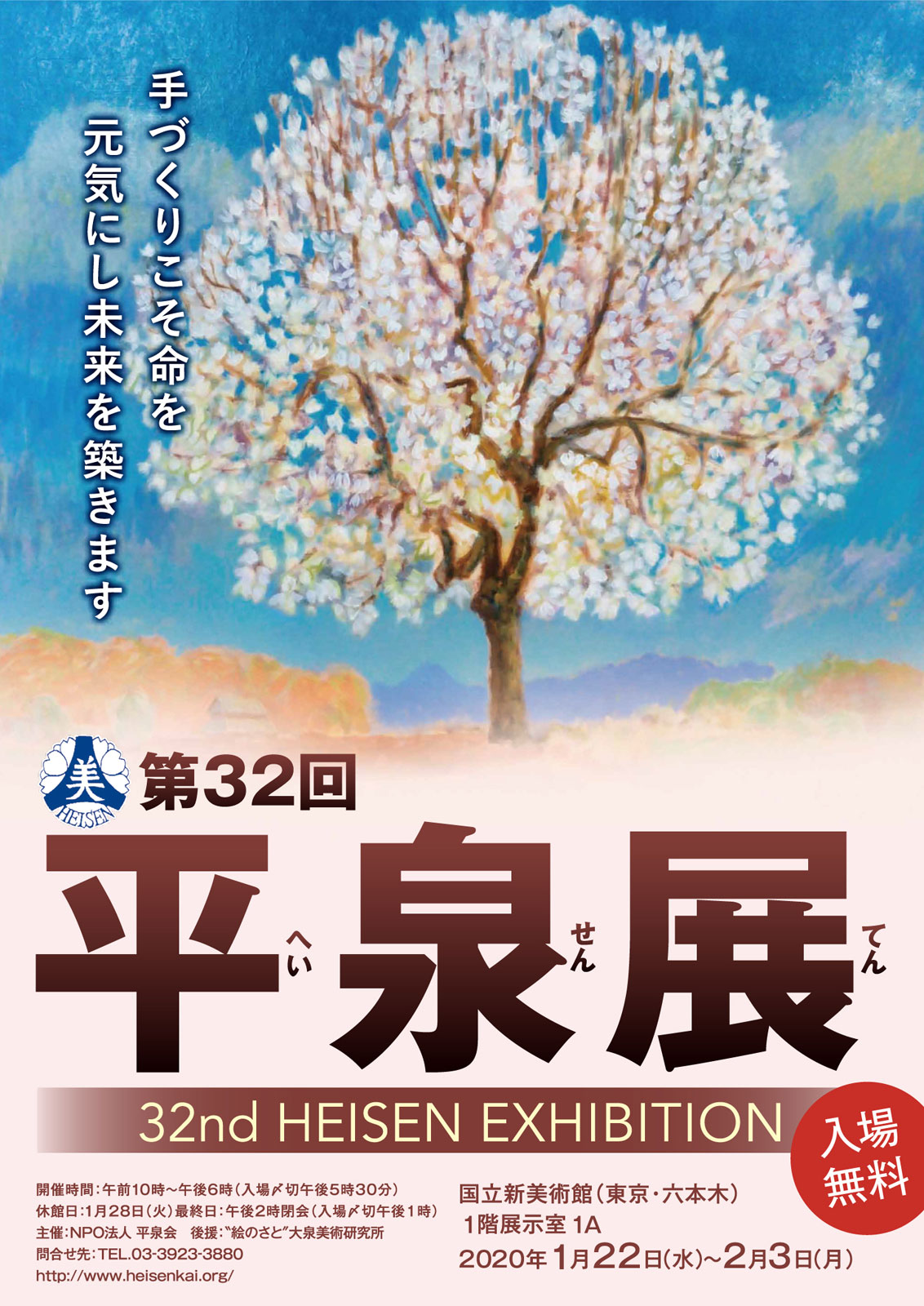 第32回 平泉展(へいせんてん) 『自然を想う新世紀芸術』 手づくりこそ 命を元気にし 未来を築きます 油彩・水彩・版画・写真・染色・織・キルト・書・陶芸・工芸etc. ◇入場無料 会期:2020年1月22日(水)〜2月3日(月) 午前10時〜午後6時(入場〆切午後5時30分) 1月28日(火)休館 最終日午後2時閉会(入場〆切午後1時) 会場:国立新美術館 1階展示室 1A 第32回平泉展(へいせんてん) 募集要項(一般)・申込書 ![]() ポスターPDF ![]() ![]() PDF PDF |